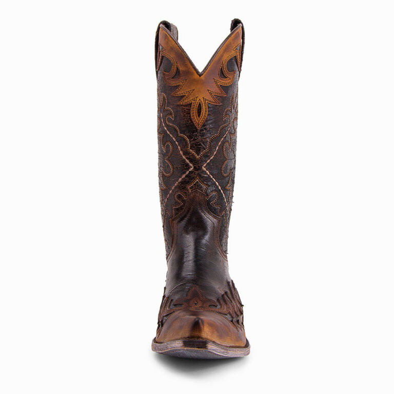Santiags en cuir de vachette bi color, aspect patiné, on aime son look cowboy . Les bottes sont de la marque Sendra,made in Espagne . Vous avez un talon cubain et un nez de requin, les tires oreilles pour vous aider à les enfiler. On retrouve une semelle cuir, une finition goodyear, vous ne serez pas déçu par une aussi belle qualité.