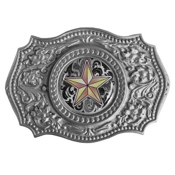 Boucle sculptée à motif floral en volutes, de style western. Une étoile jaune sous une couche d’époxy transparent orne le centre. Convient aux ceintures jusqu’à 4,4 cm de large. Dimensions de la boucle : 9,5 cm x 6,7 cm