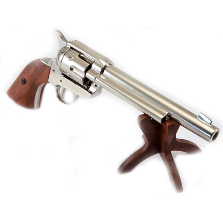 Le revolver Peacemaker, également connu sous le nom Single Action Army (de SAA), a été conçu par Samuel Colt en 1873 et a été fabriqué avec différentes longueurs de canon: la version courte de 4,75 pouces, les formes plus, 5,5 et 7,5 pouces, ou l’imposante « Buntline Special », 12 pouces.