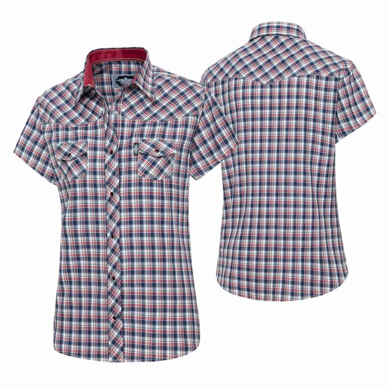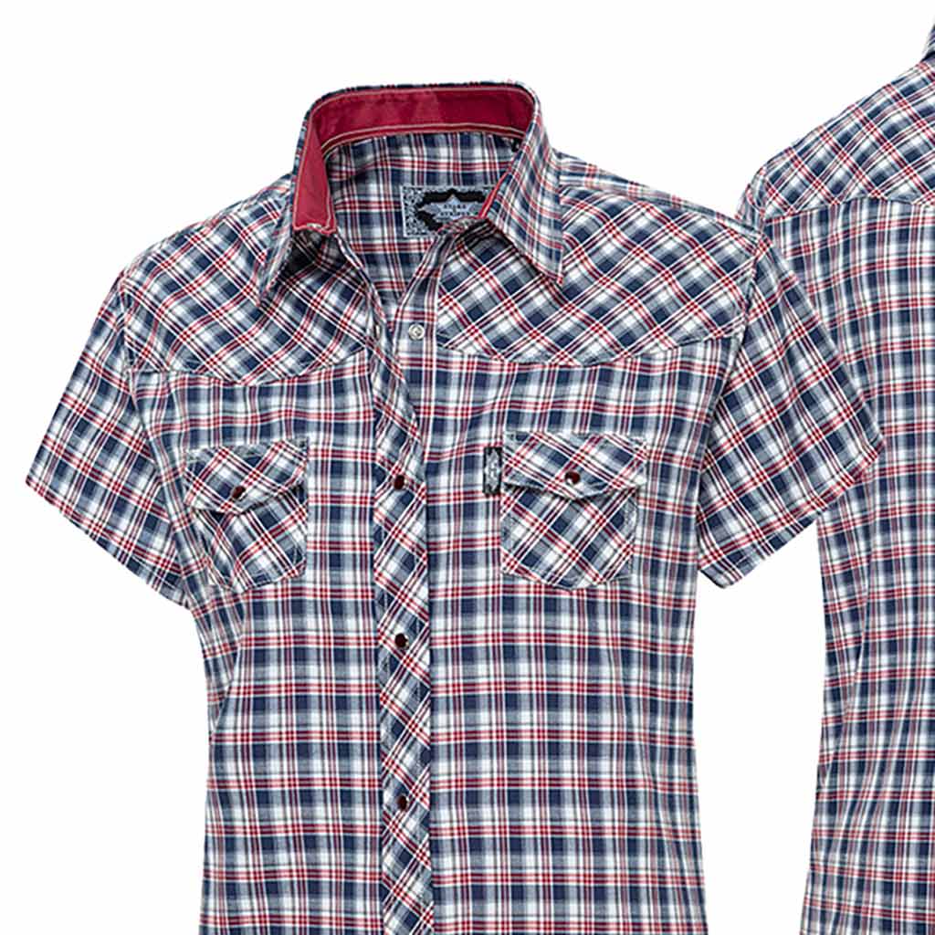 Chemisier à carreaux à manches courtes avec empiècement western, poches poitrine plaquées, boutons-pression et garniture en satin à l’encolure
