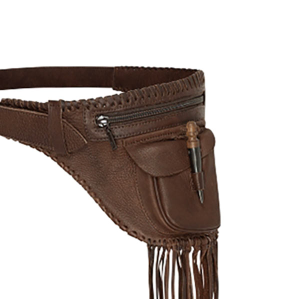 Sac de hanche en cuir avec franges et poche extérieure décorée d’une dent de sabre. Il est polyvalent et peut également être porté en cross body ou en bandoulière. Disponible également en noir ou en beige.